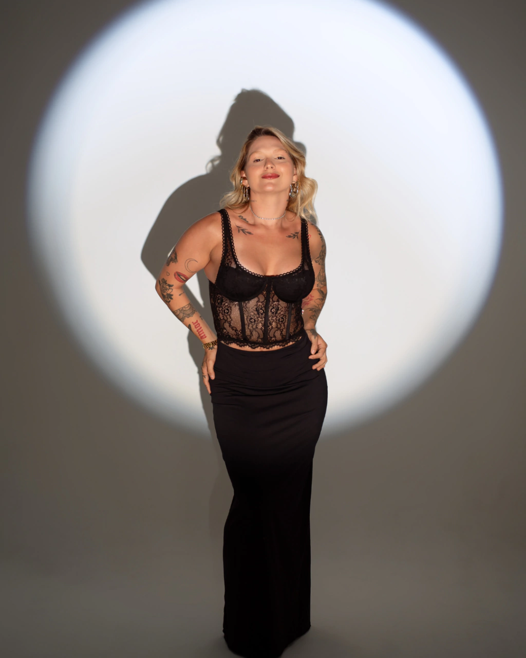 Além disso possui cordões de cetim na parte de trás que permitem a regulagem do corselet pra que ele encaixe melhor no seu corpo.