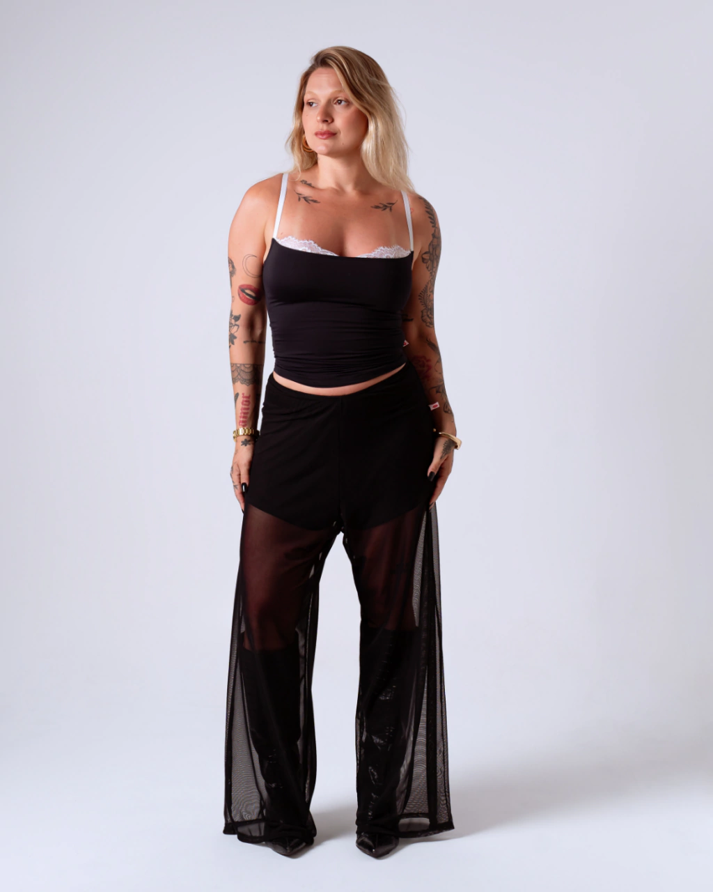 Todo em malha poliamida, que é feito 100% em poliamida, com proteção UV, e tecido duplo com a modelagem da regata basic, com um toque de trend: renda embutida similar a um sutiã.