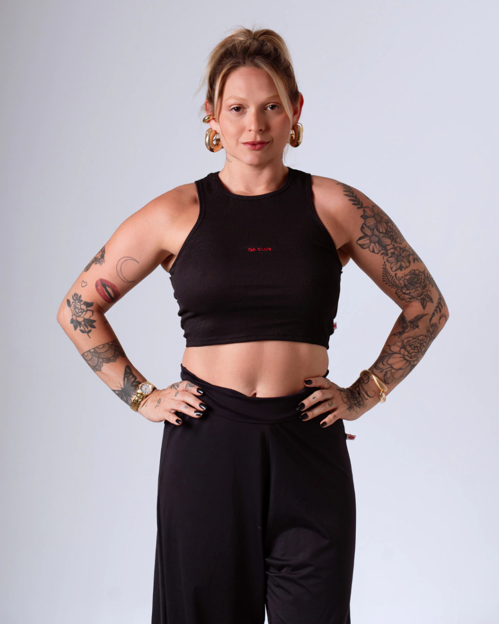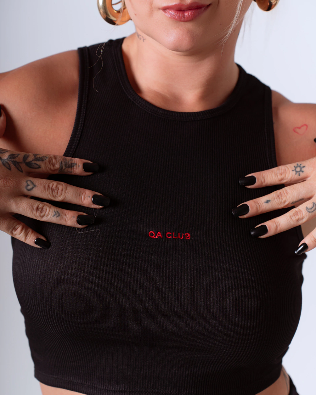 Todo em malha canelada, decote nadador, com bordado na parte da frente escrito QA CLUB.