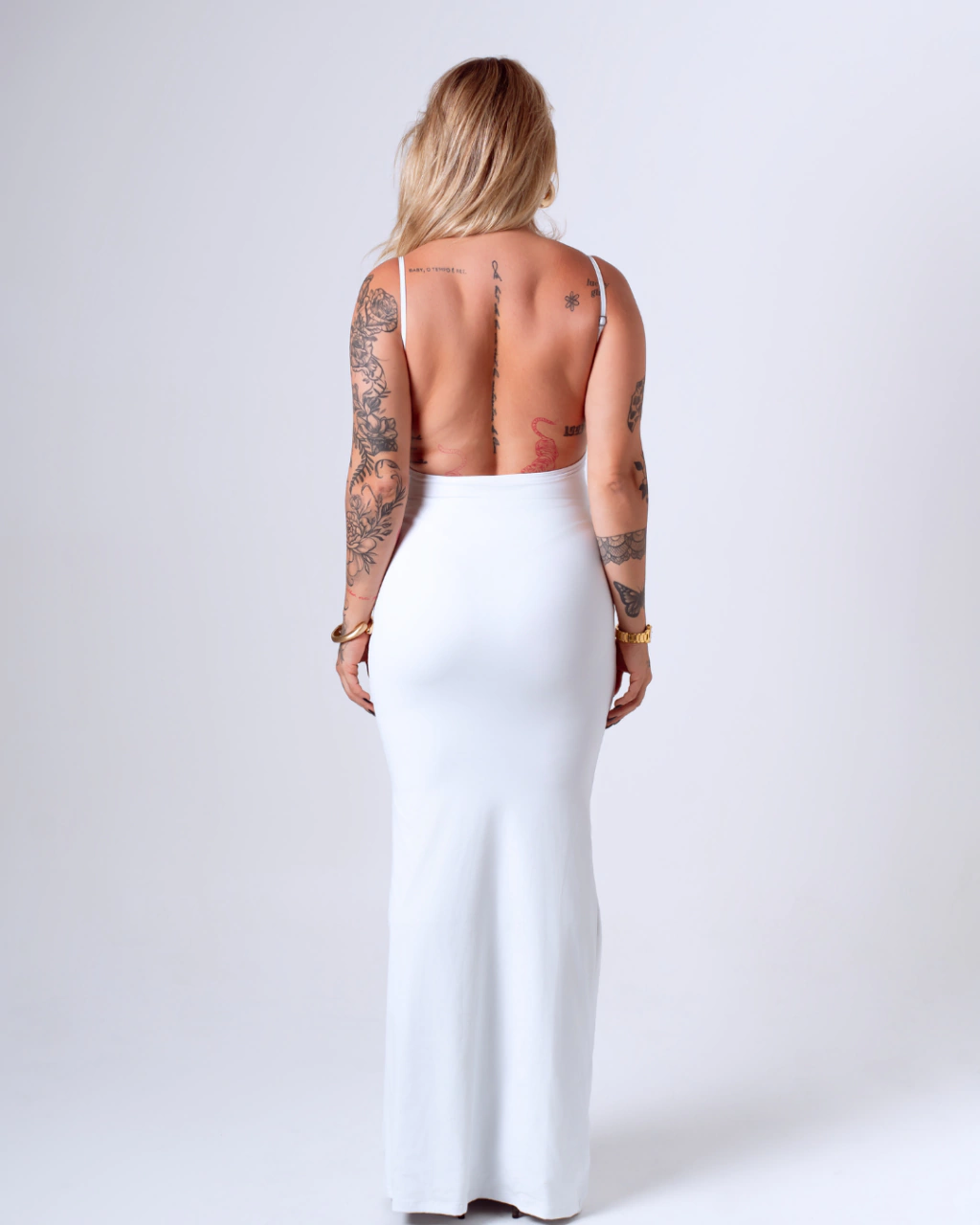 Com modelagem longa e decote profundo nas costas. Possui alças reguláveis para que você possa adequar melhor ao seu corpo.